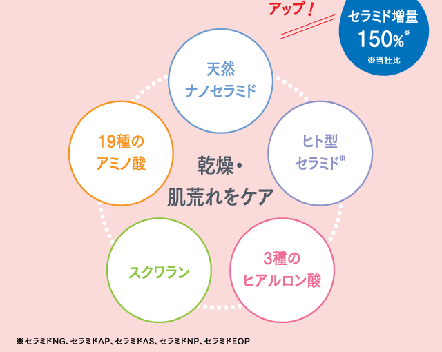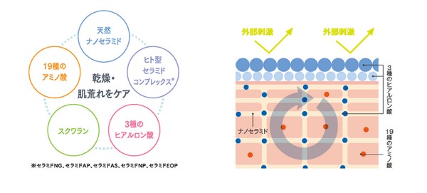 「セラミド」は、肌の角質細胞の間を埋める「細胞間脂質」の50%を占める成分です。 この成分は 「水分保持機能」 を持ち、外部刺激からの 「バリア機能」 をサポートする肌の潤いを支えている大切な成分です。