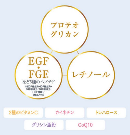 C EGF・FGFなど5種のペプチトド、プロテオグリカン、コエンザイムQ10、レチノール