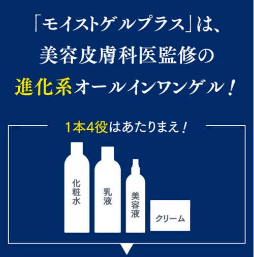 モイストゲルプラス一つで、乳液、美容液などいくつもの化粧品の役割を持つ化粧品です。